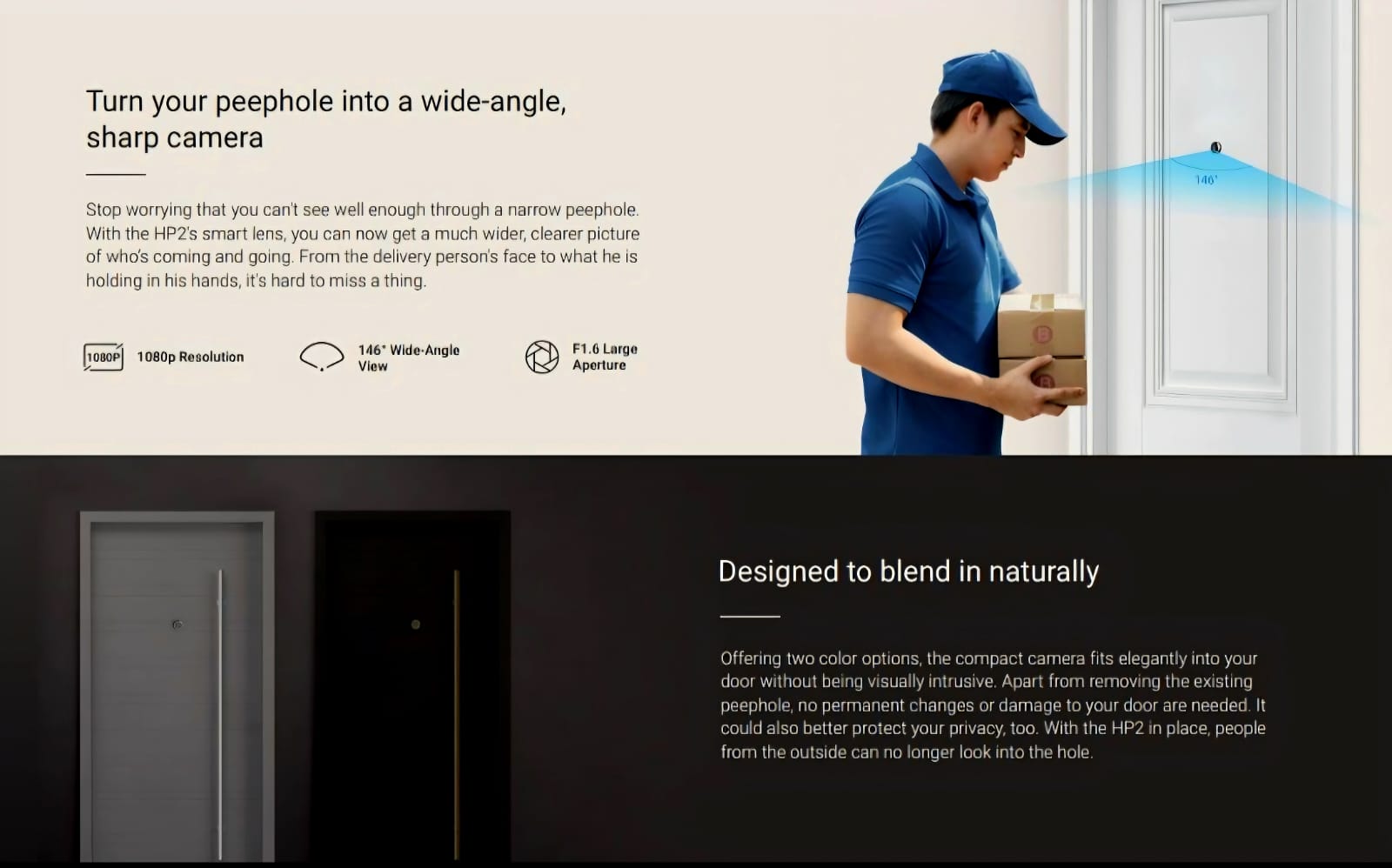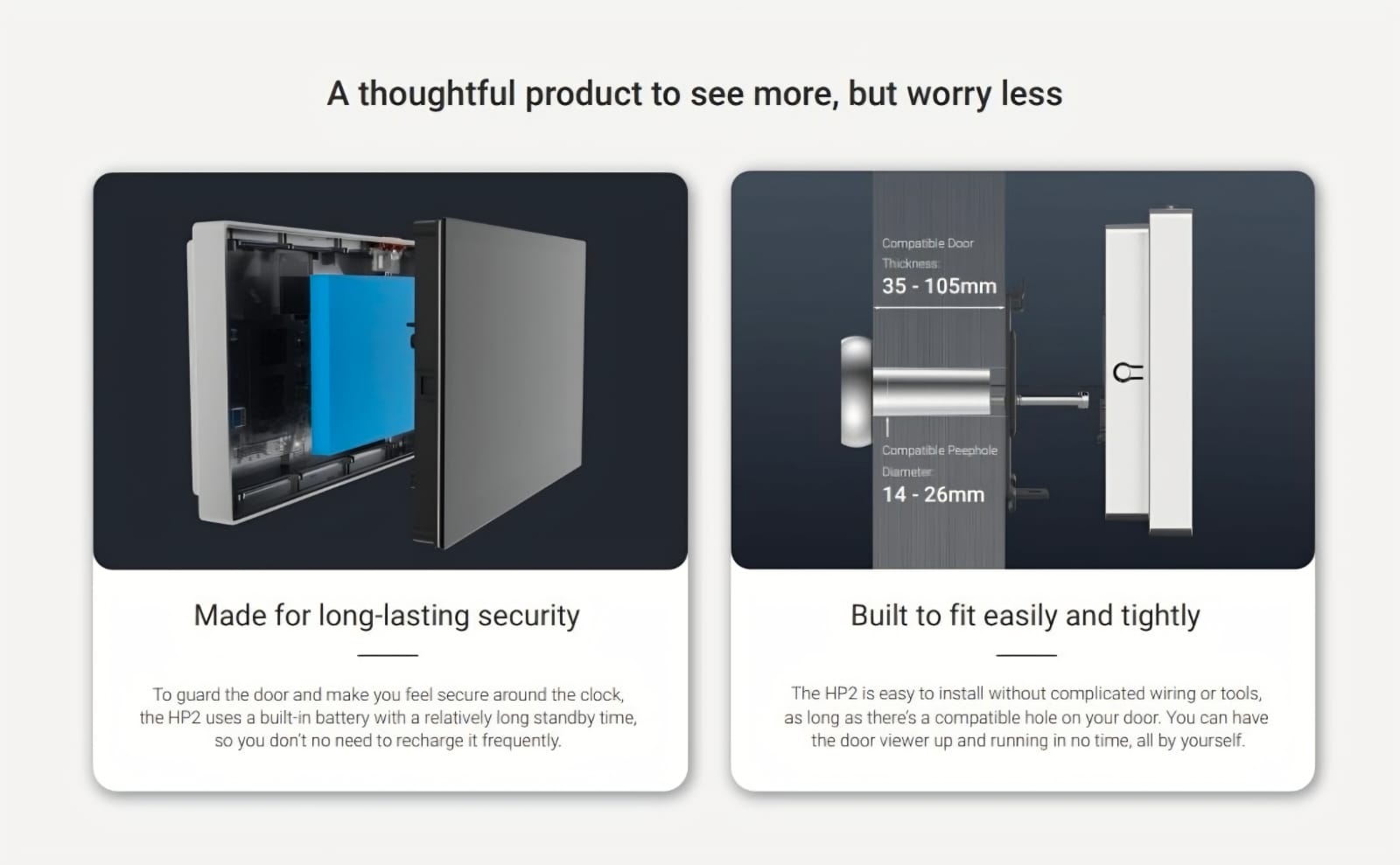 - The HP2 combines a compact peephole camera with an indoor screen for quick viewing.